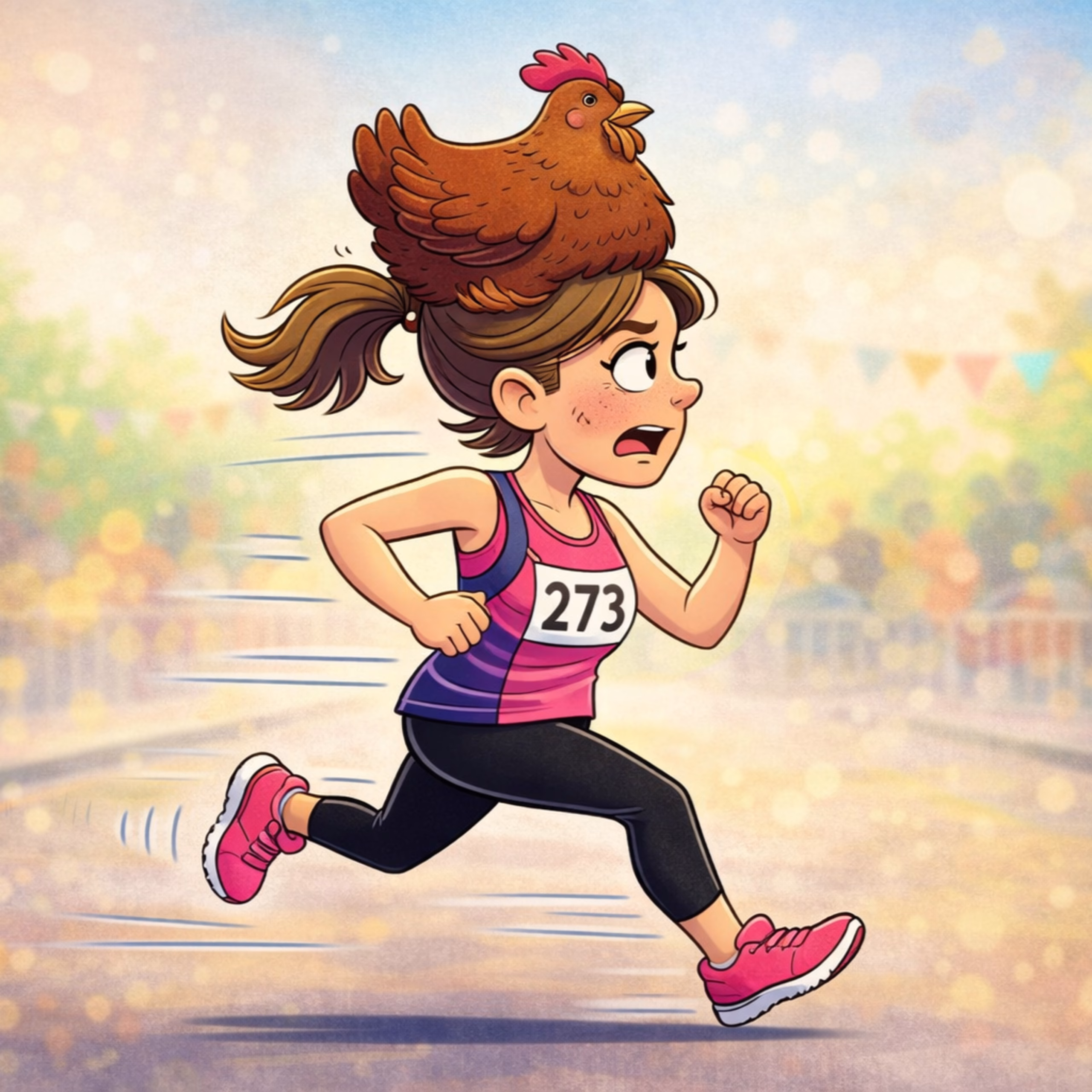 Twenty minutes of chicken wrangling later, Mum continues the race with a Rhode Island Red nesting on her head and another chicken sleeping under her arm like a feathery handbag. The sleeping chicken wakes at mile seven and lays an egg. Mid-run. Mum catches it one-handed without breaking stride.